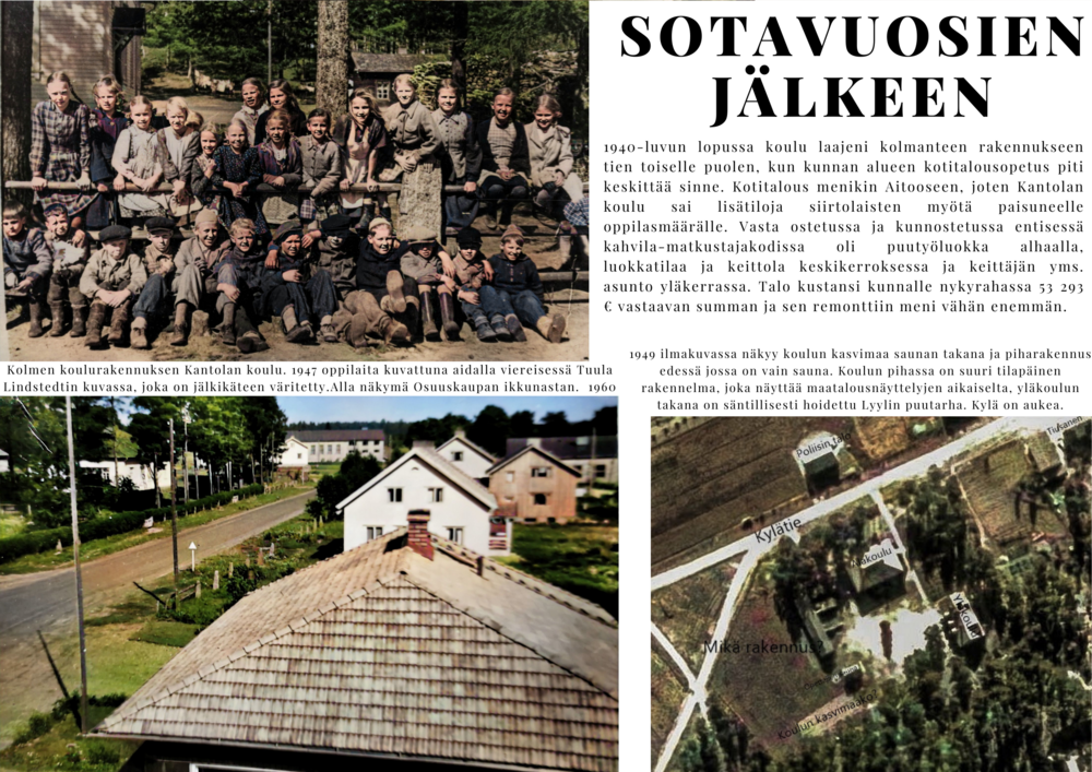 Koulun eisttleytaulut saatiin nipin napin valmiiksi ja esille. Vielä on esitysteknisiä haasteita kuvan tarkkuudessa ja selvitettävää opettakunnan vaiheista 90-luvun alusta tähän päivään sekä muun henkilökunnan vaiheista. Niistä ei Luopioisten koululaitoksen historiassa niin löytynyt tietoa. Myös kivikoulun rakennuspiirrustukset lymyävät jossakin arkistossa. Olisi se ollut melkoinen kolossi, jos suunnitelmien mukaan kylälle olisi rakennettu reilut 100 oppilasta vetävä ja viisi henkilökuntaan kuuluvaa kotitaloutta majoittava talo liikuntasaleineen ja kerhotiloineen. Tässä kohtaa lienemme enemmän kiitollisia, että semmoista tiililinnaa ei tällä harjunreunalla ole.